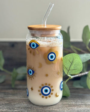 Evil Eye Glass Cup with Glass Straw